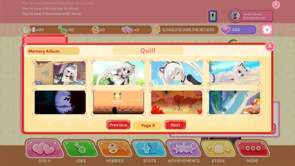 And how do you get more reset currency? Two main ways: deep progression in a single run (like getting a girl to “Lover” status), and—this is the big one—Achievements. Achievements are one-time goals that give you a chunk of reset currency the moment you complete them. They are your fastest, most reliable source of early boost. Check the Achievements tab regularly! Goals like “Reach Level 10 in any Hobby” or “Promote a Job 3 times” are perfect early targets that will fund your first few resets.
